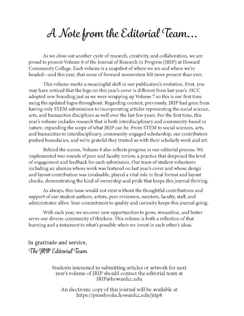 A Note from the Editorial Team Copyright © 2025 by JRIP Editorial Team is licensed under a Creative Commons Attribution-NonCommercial-NoDerivatives 4.0 International License, except where otherwise noted.